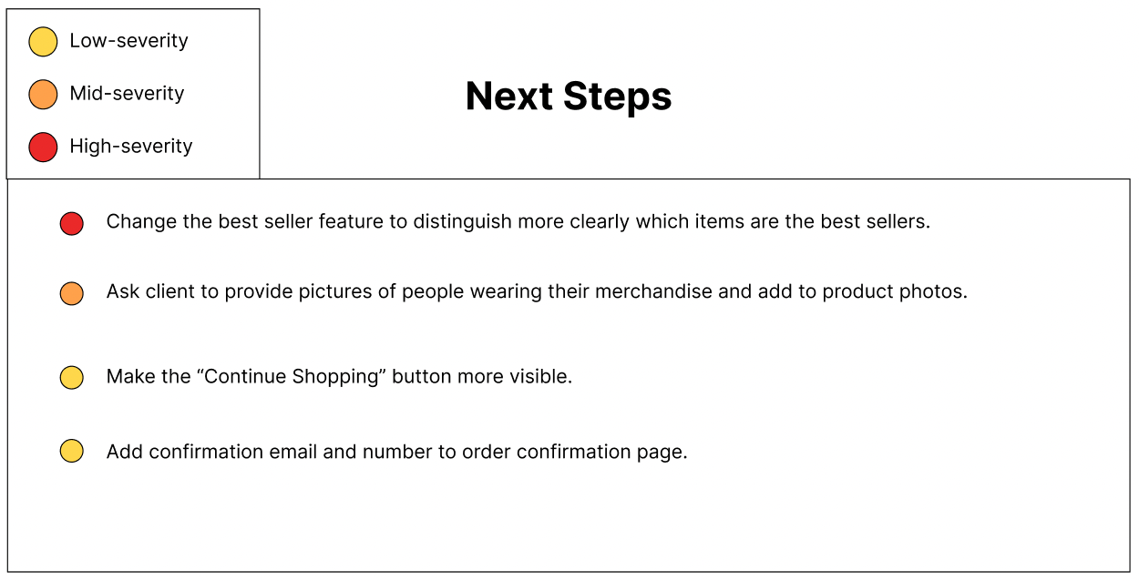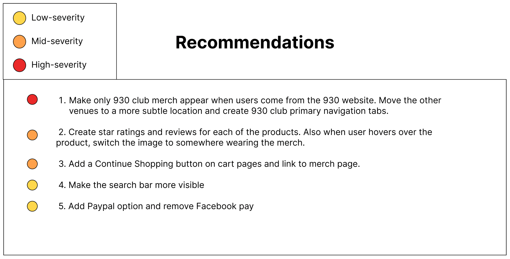 To find out how my users felt about the current 9:30 Club website I ran, I gave each of my 3 participants two tasks to complete: search for a beanie and water bottle then complete the checkout process. I measured the success of these tasks as described in the usability test plan. I then created a results table and synthesized my findings into the “Recommendations” on the right.